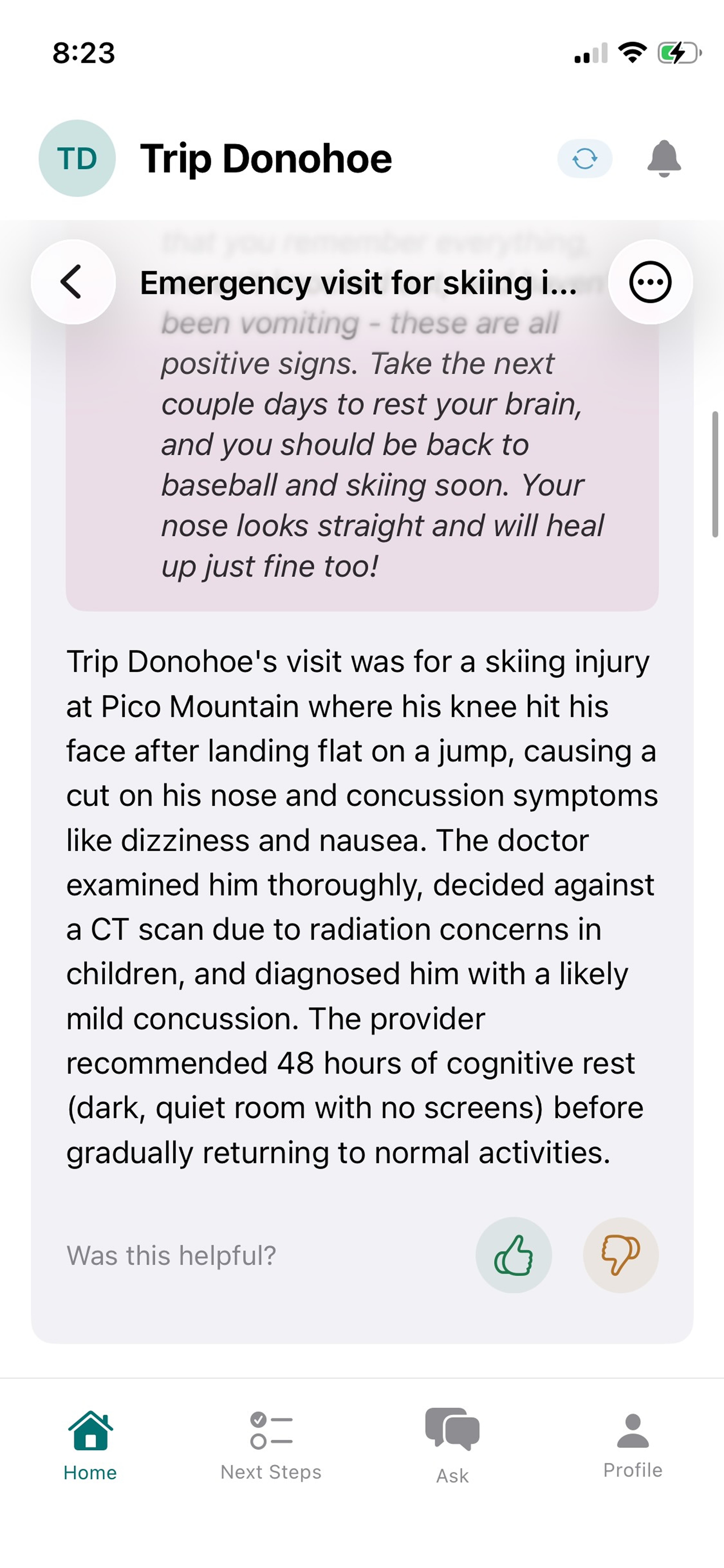 A plain-English summary lands in the app. Every clinical term is explained the way you need to hear it. Next steps, new meds, and things to watch are clearly listed and shareable in one tap.